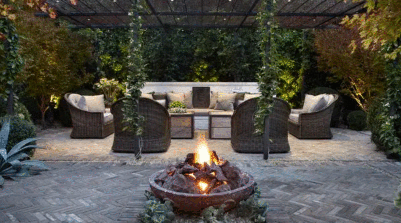 Jardim Aconchegante com Luzes, Móveis e Elementos Naturais